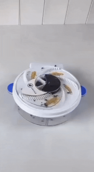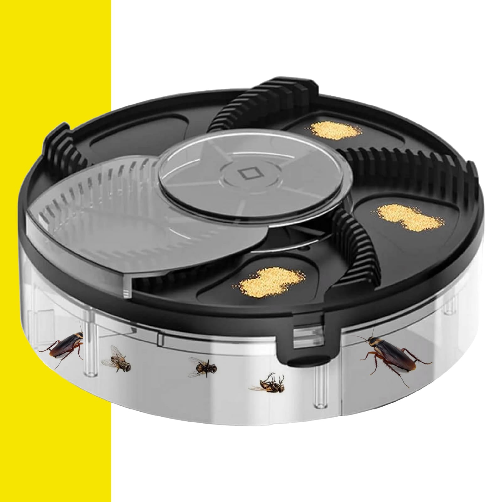 💡 CÓMO USARLO: 1️⃣ Coloca un poco de miel o agua con azúcar en las 5 ranuras (¡no uses objetos duros!). 2️⃣ Conecta el dispositivo y enciéndelo. 3️⃣ Las moscas serán atraídas al cebo y el plato giratorio las atrapará en la caja. 4️⃣ Retira y limpia la caja cuando esté llena.